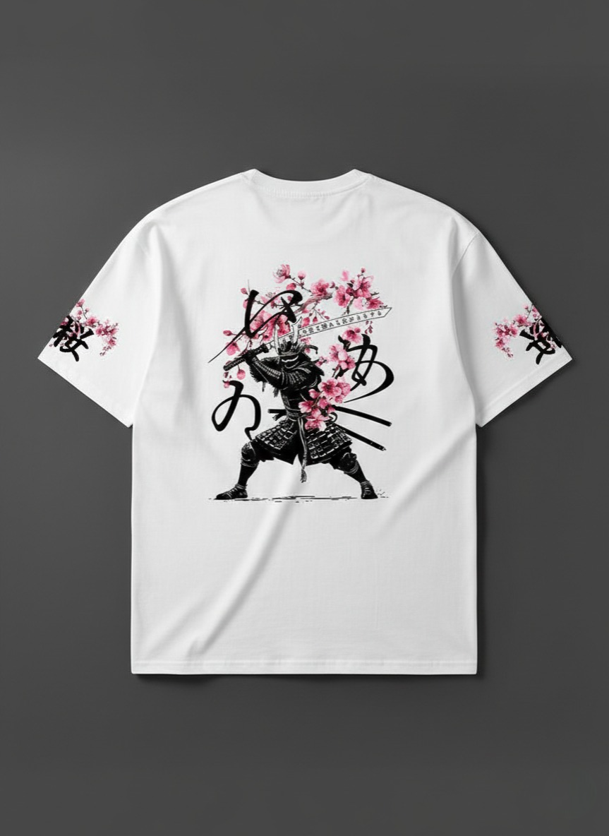 • Artistic Samurai Graphic: Features a large, detailed back print of a Samurai swordsman surrounded by vibrant pink Sakura blossoms.