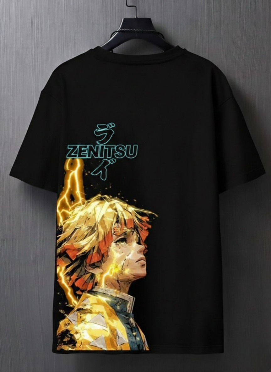 Constructed on a premium deep black base, the design features Zenitsu in a moment of pure focus, surrounded by electric yellow lightning bolts that create a brilliant “glow” effect. The teal “ZENITSU” typography and Japanese katakana add a modern, stylized touch. The drop shoulder silhouette provides a relaxed, boxy fit that is essential for current streetwear trends.